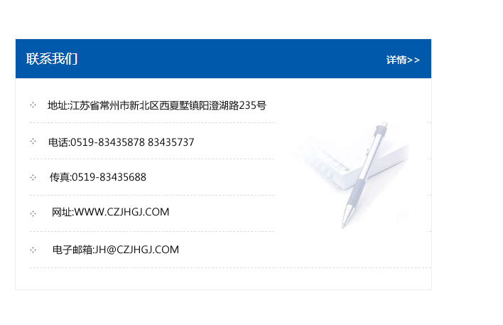 地址:常州市新北區(qū)友邦商務(wù)大廈1幢16、17層  電話:0519-85101652  傳真:0519-85112595  郵編:213022  網(wǎng)址:www.cz-jiayue_cn.2856897.com  郵箱:xiajifengaa@163.com